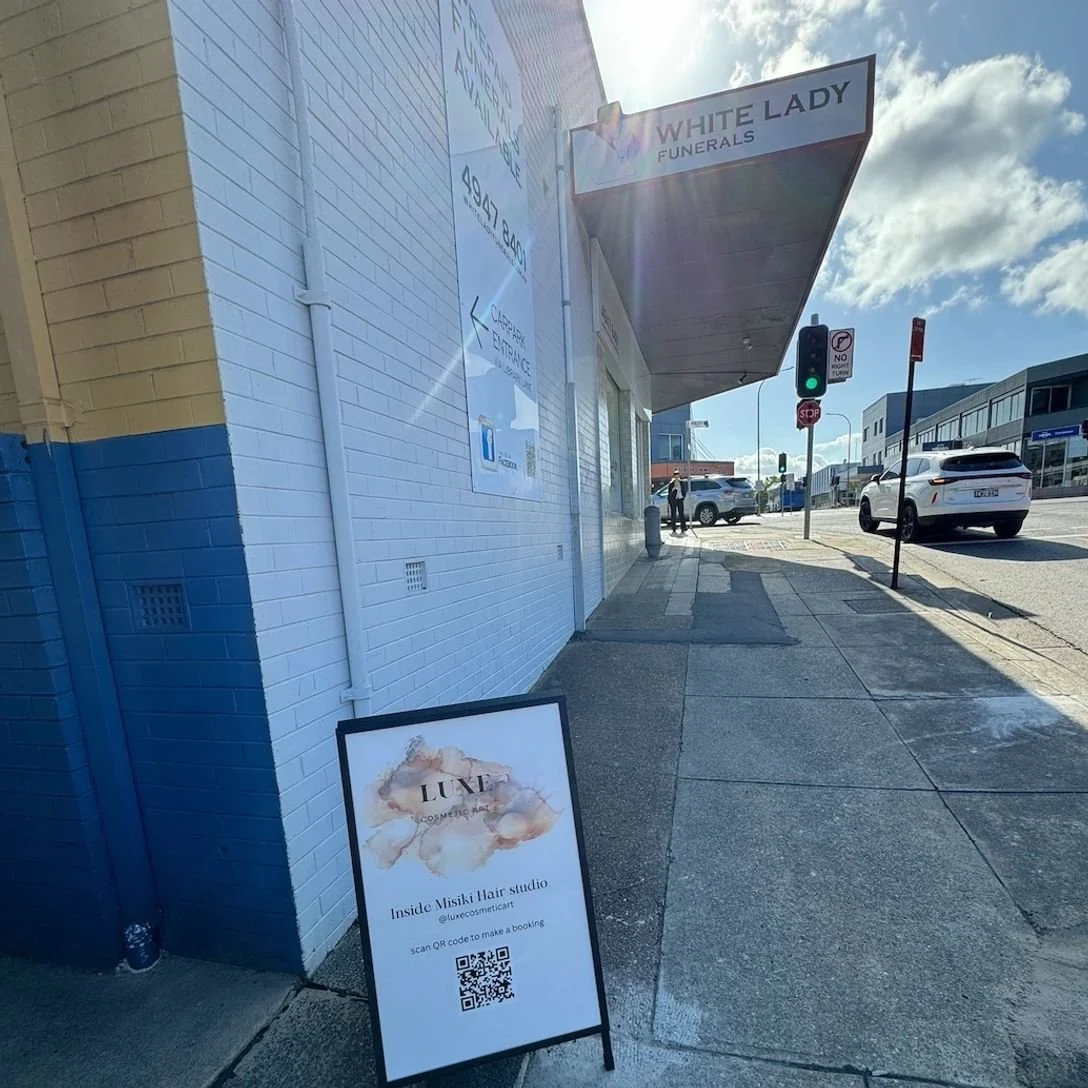 Luxe cosmetic art works out of Misiki hair studio. Which is located up a small flight of stairs around the corner from White Ladys Funerals. Below is photos for reference of where the salon is.